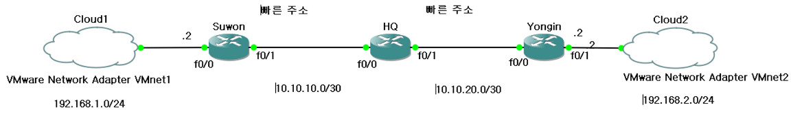 192.168.2.0(cloud2)로 가는 IP는 HQ에서 YongIn쪽(10.10.10.2)으로 나간다.
