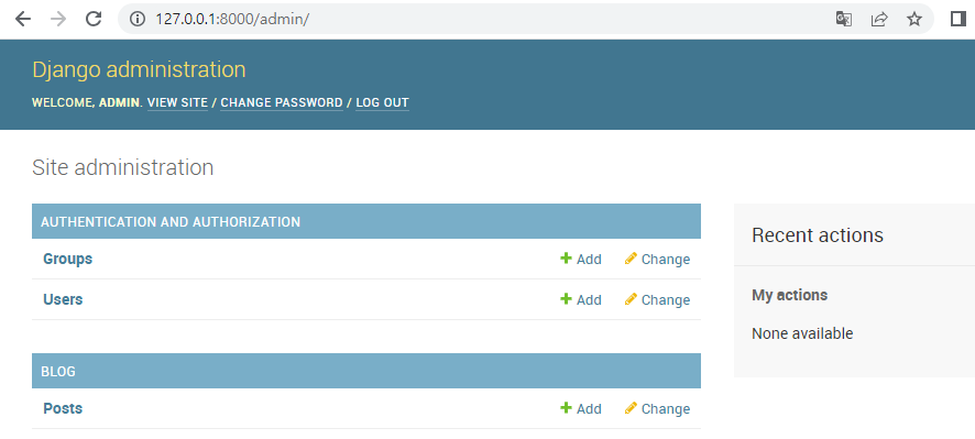 아까 만든 슈퍼유저로 로그인을 하면 다음과 같은 관리자 페이지로 접속할 수 있다.