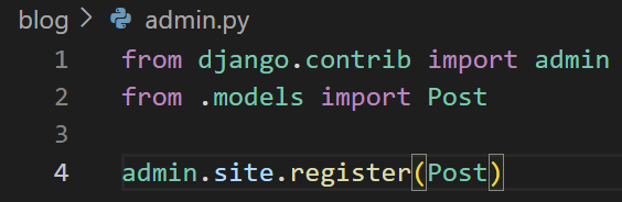 앞서 만든 Post 모델을 관리자 페이지에서 볼 수 있도록 blog\admin.py에 등록