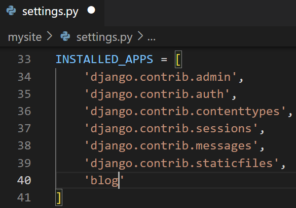 mysite\settings.py에 'blog'를 추가하여 해당 애플리케이션에 대한 내용을 등록