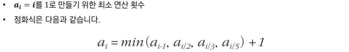 i를 1로 만들기 위해서는 4가지 경우에서 가장 작은 값을 골라 1을 더한 값과 동일하다.