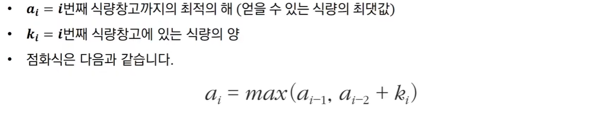 d[i]에서 i번째 식량창고까지의 최적의 해를 구하면 얻을 수 있는 식량의 최댓값을 구할 수 있다.