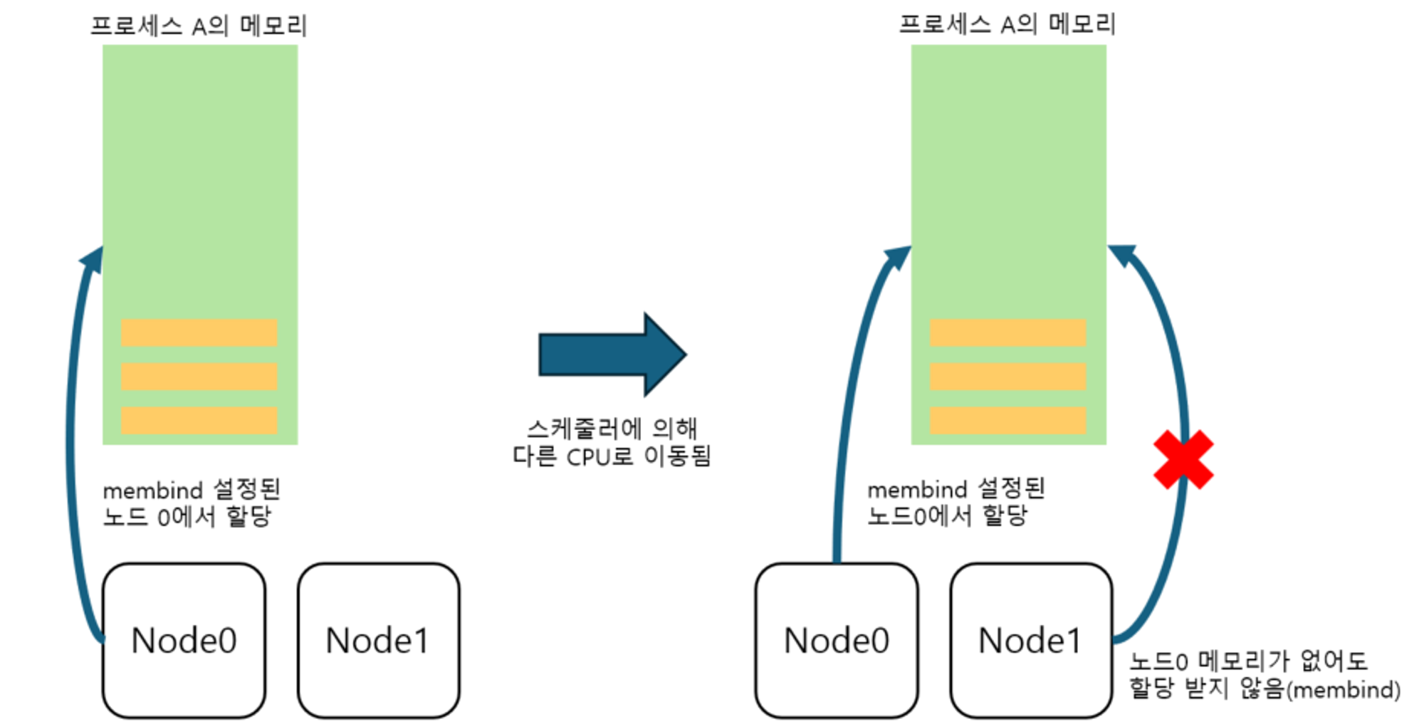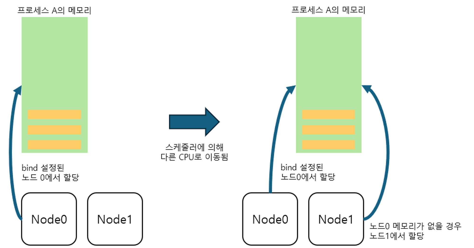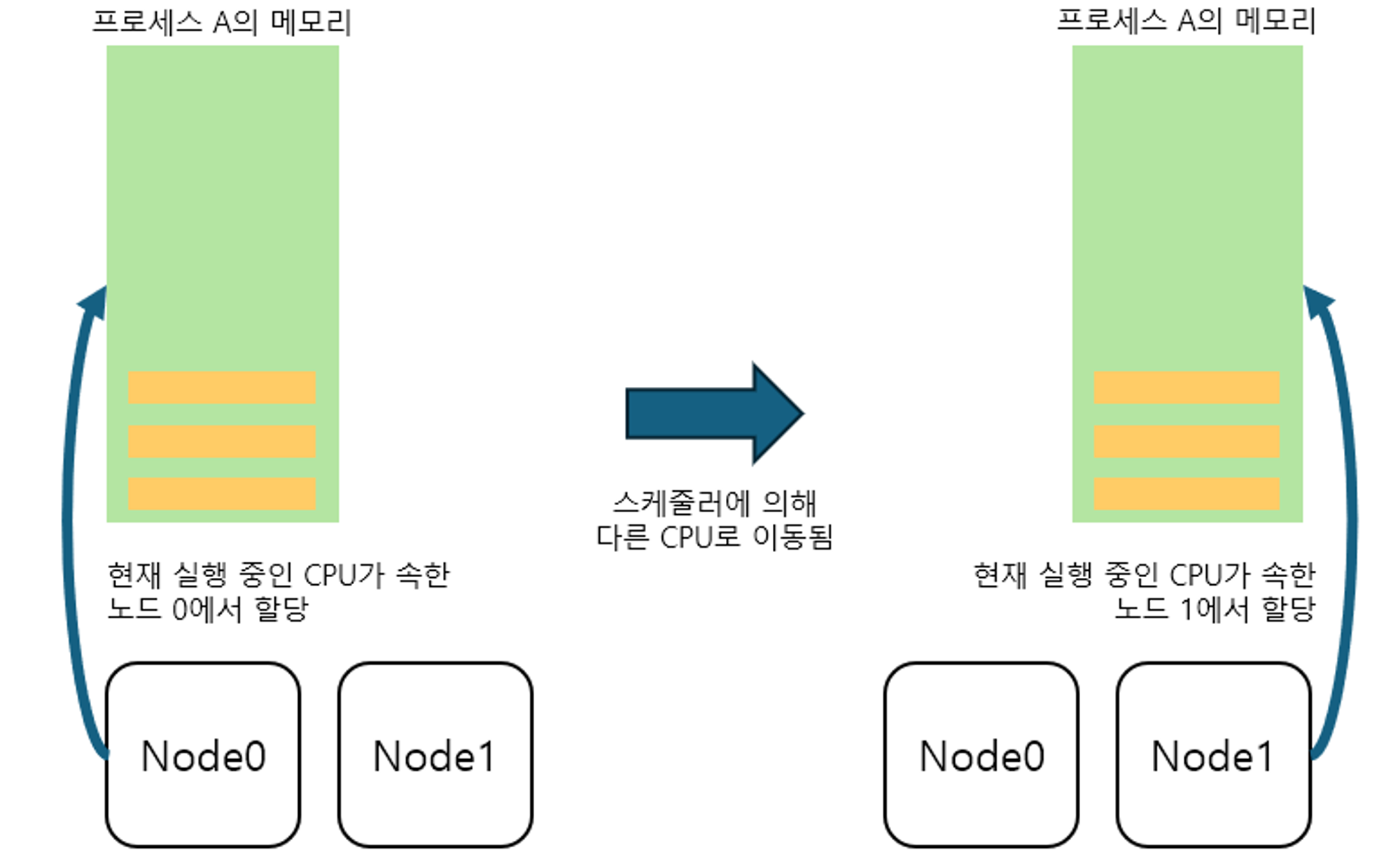 리눅스 스케줄러는 가능한 한 기존에 바인딩된 노드에 계속 바인딩되도록 하려는 경향이 있기 때문에 한쪽 노드에서 할당 가능한 메모리의 양을 넘지 않는 한 크게 문제가 되지 않는다.