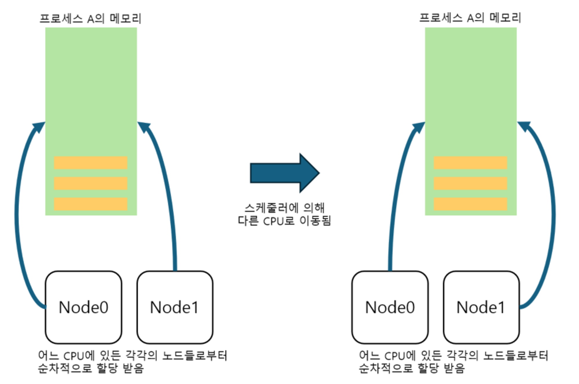 어느 노드에 속한 CPU에서 돌아가고 있는지 상관없이 각 노드들로부터 순차적으로 메모리 할당을 받는다.