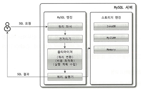 다른 스토리지 엔진을 사용하는 테이블에 대해 쿼리를 실행하더라도 MySQL의 처리 내용은 대부분 동일하며, 데이터 읽기/쓰기 영역의 처리만 차이가 있을 뿐이다.