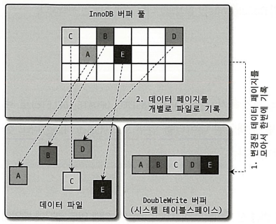 'C'페이지가 기록되는 도중에 운영체제가 비정상적으로 종료됐다고 가정. InnoDB 스토리지 엔진은 재시작될 때 항상 DoubleWrite 버퍼의 내용과 데이터 파일의 페이지들을 모두 비교해서 다른 내용을 담고 있는 페이지가 있으면 DoubleWrite 버퍼의 내용을 데이터 파일의 페이지로 복사한다.