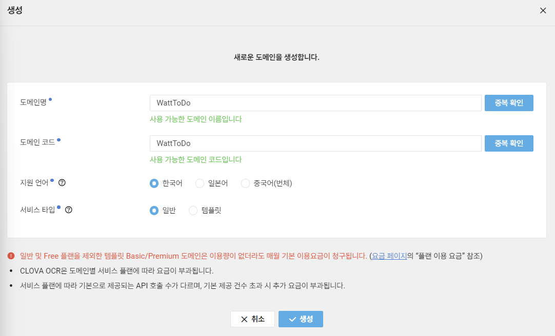 현재 진행하고 있는 프로젝트의 명인 'WattToDo'라고 지정했다. 한국어를 지원해야 하기에 한국어를 선택해서 생성해줬다.