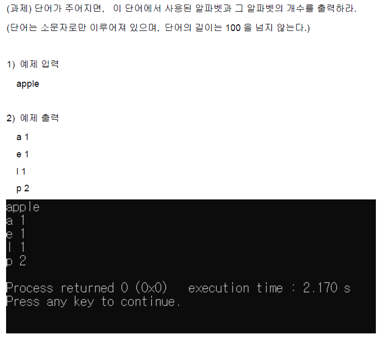 str에 문자열을 입력받고 for문을 통해서 arr에 받아준 문자열의 길이를 구해준다. 이를 통해 다음 반복문 안에 조건에 쓸 것이다. for문에서 a부터 z까지 반복하며 arr이 0보다 크다는 것은 위의 for문을 통해 그 자리에 문자열이 들어있는 것을 알 수 있고 이러한 조건식을 통해 printf로 출력을 해준다.