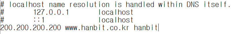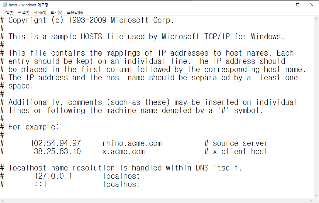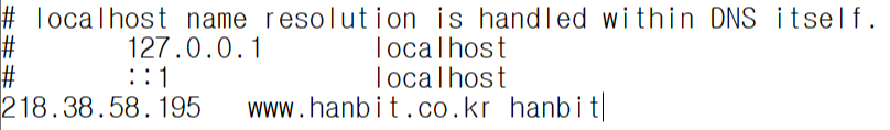 hosts 파일을 수정할 때에는 IP 주소와 호스트 이름을 적어주면 된다.