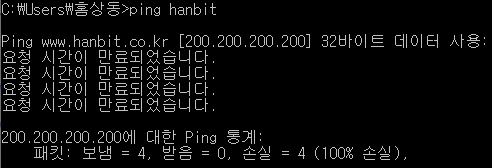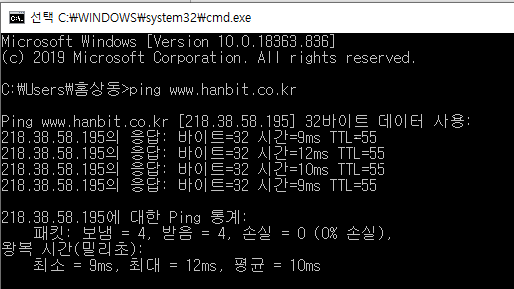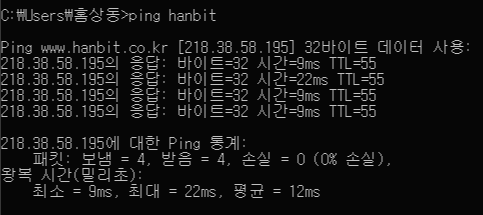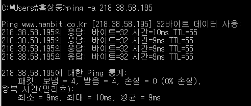 'hanbit'로 ping을 실행해도 똑같이 ping이 보내짐을 확인할 수 있다.