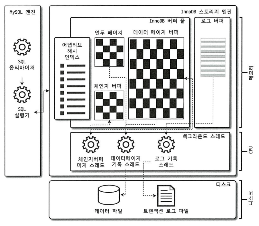 이전 글 [CS]MySQL 아키텍처1_MySQL 엔진서론SSAFY를 하며 CS 스터디를 진행하고 있다. CS 스터디에서 OS 파트를 진행할 때는 블로그 포스팅을 하지 못했지만, 이번 DB 파트에 대해서는 포스팅을 해보고자 한다. 포스팅의 내용은 모두 Real Myseomj74.tistory.comInnoDB구조Primary Key에 의한 클러스터링클러스터링이란? 데이터 레코드가 특정 키의 순서에 따라 디스크에 물리적으로 정렬되어 저장되는 것클러스터링이 적용되는 키를 클러스터링 인덱스라고 부른다. 세컨더리 인덱스란?Primary Key를 제외한 테이블의 다른 모든 인덱스를 통칭보조 인덱스라고도 한다. InnoDBPrimary Key가 클러스터링 인덱스세컨더리 인덱스는 Primary Key의 값을 논리적인 ..