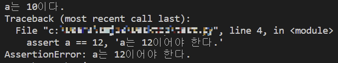assert 뒤의 조건이 True가 아니면 AssertError를 발생 지금까지 잘 움직이던 코드지만, 추가로 코드를 작성했을 때 예상하지 못한 다르동작을 하게 될 경우 assert문을 작성해둠으로써 빠르게 이를 방지할 수 있다. 사용 방법 assert [조건], [오류메시지] 조건이 True인 경우 어떠한 메시지도 출력하지 않고 진행되지만, 조건이 False인 경우 오류 메시지를 출력하며 AssertError를 발생한다. 오류메시지는 생략할 수 있다. 예제 a = 10 assert a == 10, 'a는 10이어야 한다.' print('a는 10이다.') assert a == 12, 'a는 12이어야 한다.' print('a는 12이다.') a의 변수에는 10 값이 지정이 되어있다. 첫 번째 asser..