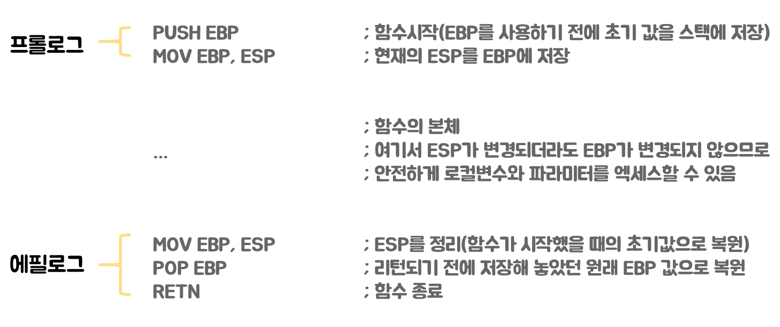 함수호출 1.함수가 사용할 파라미터를 스택에 넣고 함수 시작지점으로 점프(함수 호출)한다. 2.함수 내에서 사용할 스택프레임을 설정한다. (프롤로그) 3.함수의 내용을 수행한다. 4.수행을 마치고 처음 호출한 지점으로 돌아가기 위해 스택을 복원한다(에필로그) 스택프레임 함수가 호출되면 스택에는 함수의 매개변수, 호출이 끝난 뒤 돌아갈 반환 주소값, 함수에서 선언된 지역 변수 등이 저장 함수가 동작을 종료하고 복귀 주소로 돌아갈 때 스택 프레임은 소멸 ESP(스택 포인터)가 아닌 EBP(베이스 포인터)레지스터를 사용하여 스택 내의 로컬 변수, 파라미터, 복귀 주소에 접근하는 기법 EBP, ESP ESP 레지스터의 값은 프로그램 안에서 수시로 변경되기 때문에 스택에 저장된 변수, 파라미터에 접근하고자 할 때..