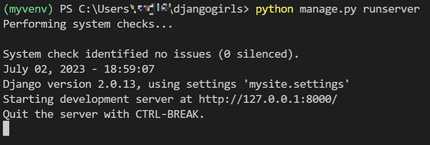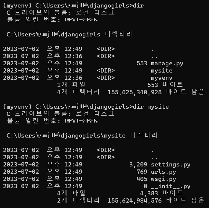 mysite라는 프로젝트를 시작하며 .(현재 디렉토리)에서 생성